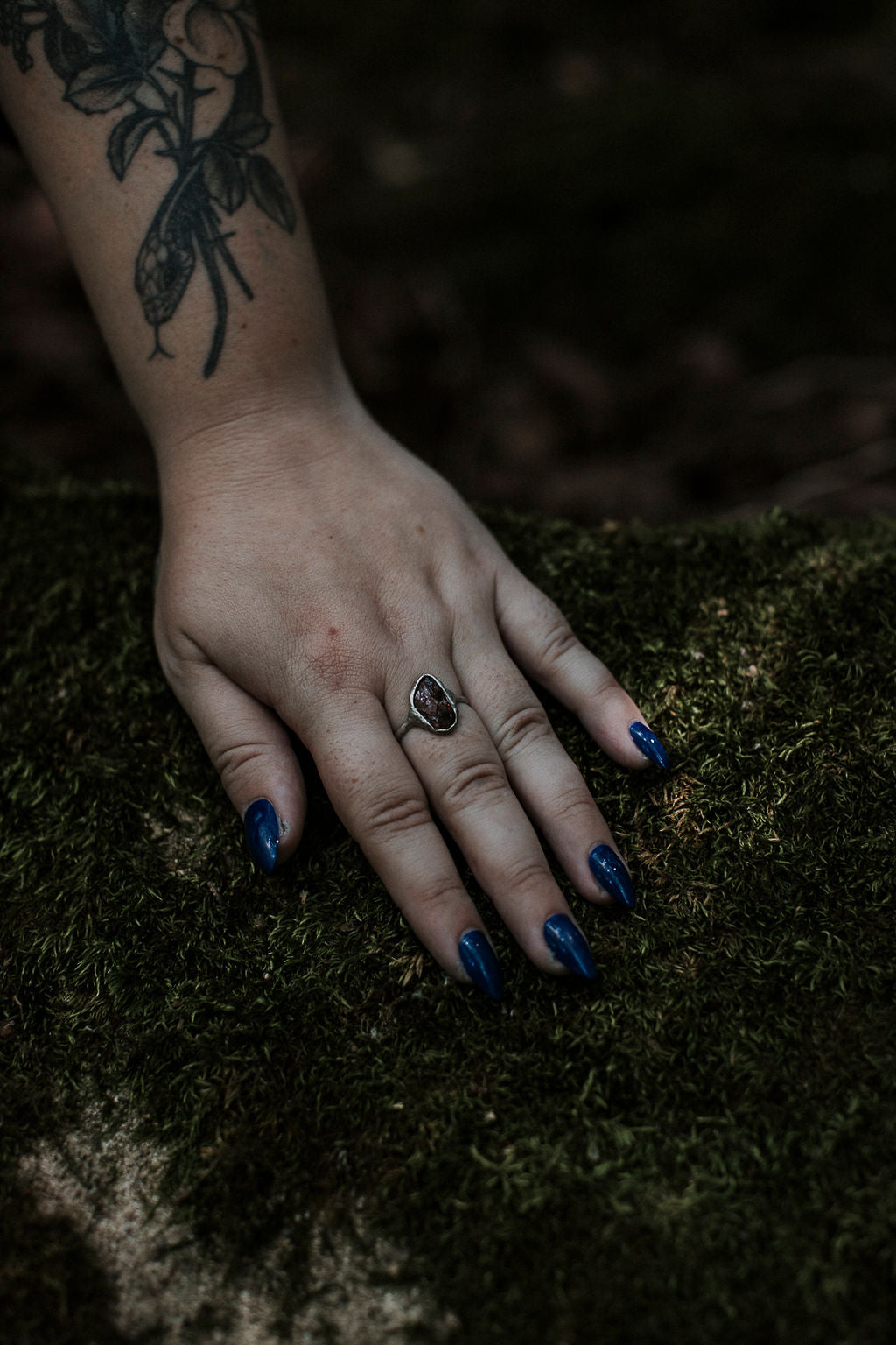 The Garnet Pebble Ring features a raw, unpolished garnet crystal—a deep red stone known for grounding, vitality, and bold self-confidence. It’s the kind of energy that says “I’ve got this” without needing to shout. Garnet supports both fierce protection and a steady burn of purpose and passion.