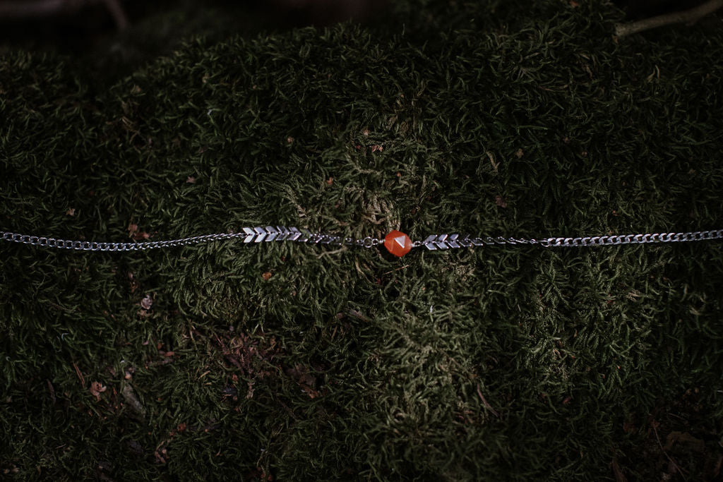 Carnelian is traditionally associated with motivation, creativity, and self-confidence. It’s often worked with when you’re feeling stuck, second-guessing yourself, or ready to move forward but need that extra spark. Paired with the clean chevron chain, this choker feels bold, modern, and unapologetically alive.