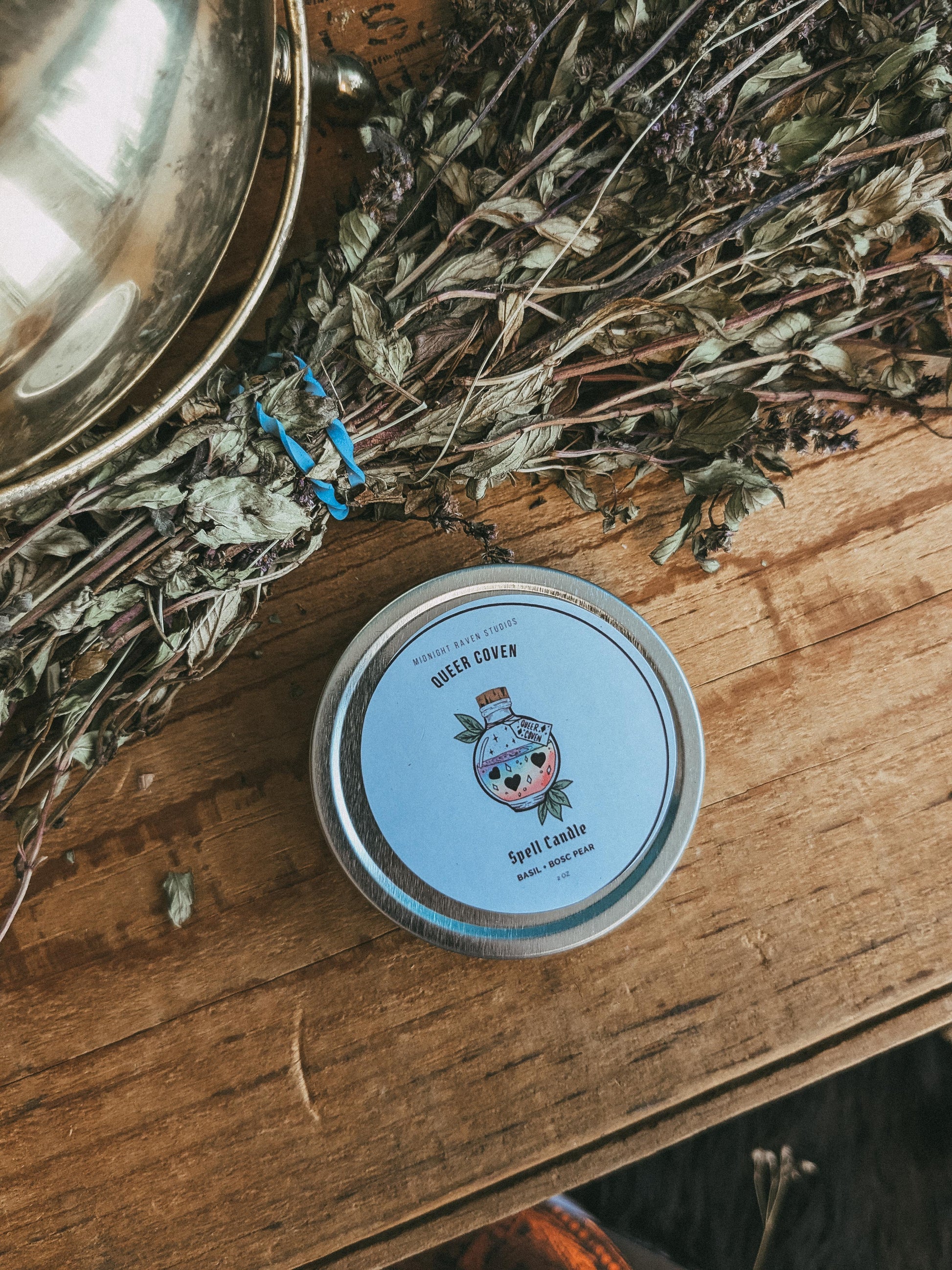 The Queer Coven Candle is a tribute to found family, spell circles, and late-night laugh-cries over tarot spreads and tea. Scented with bright, herbal basil and juicy, grounding Bosc pear, it’s fresh, inviting, and a little bit cheeky—just like your coven.