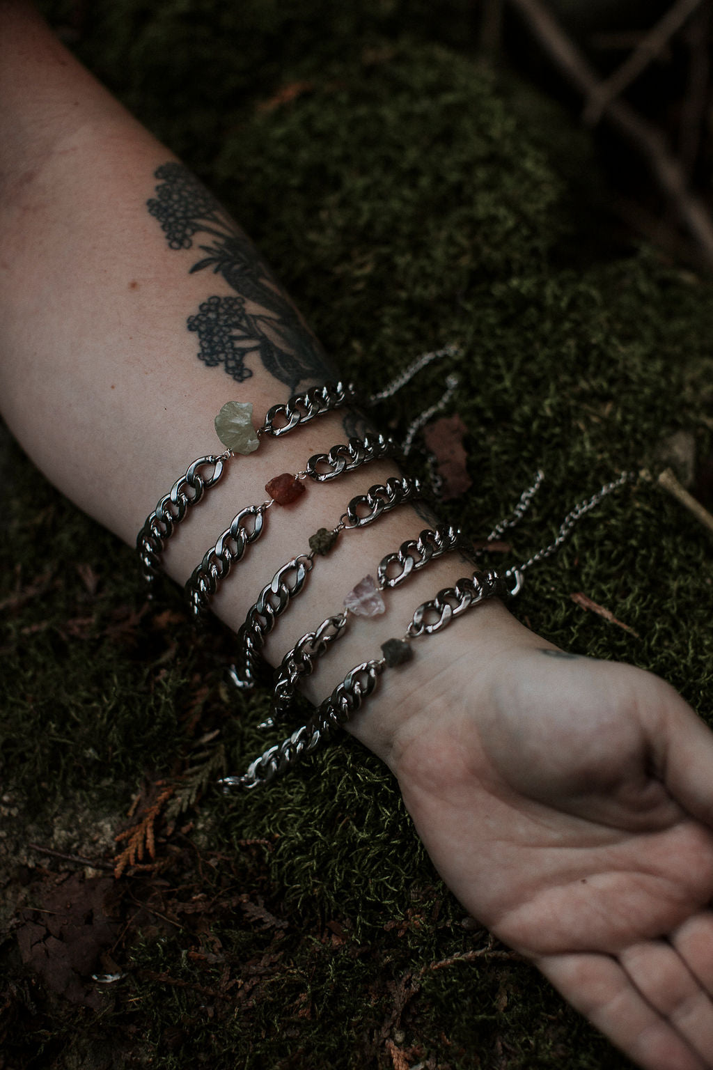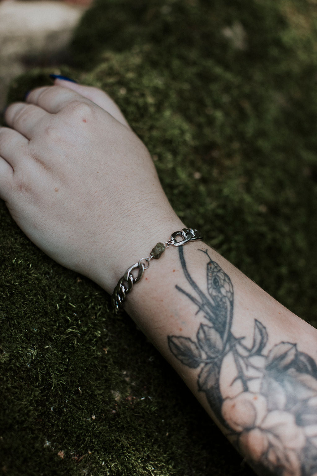 This bold bracelet features a raw labradorite stone, flickering with flashes of blue, gold, and green—like a secret only you can see. Known for its powers of intuition, transformation, and energetic protection, labradorite is your go-to stone for walking between worlds and staying grounded while doing it.