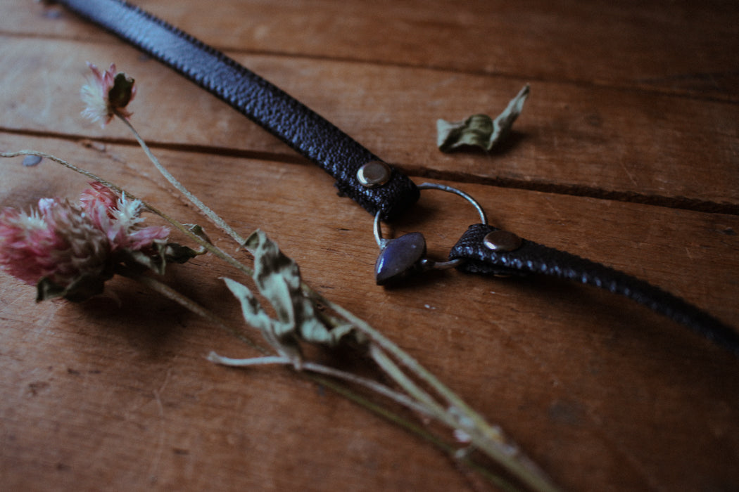Mystery. Magic. Protection. This choker features a hand-soldered labradorite ring that shimmers with flashes of blue, green, and gold—like a portal to the unseen. Known for enhancing intuition, transformation, and energetic shielding, labradorite is the ride-or-die crystal for witches navigating shadow and light.