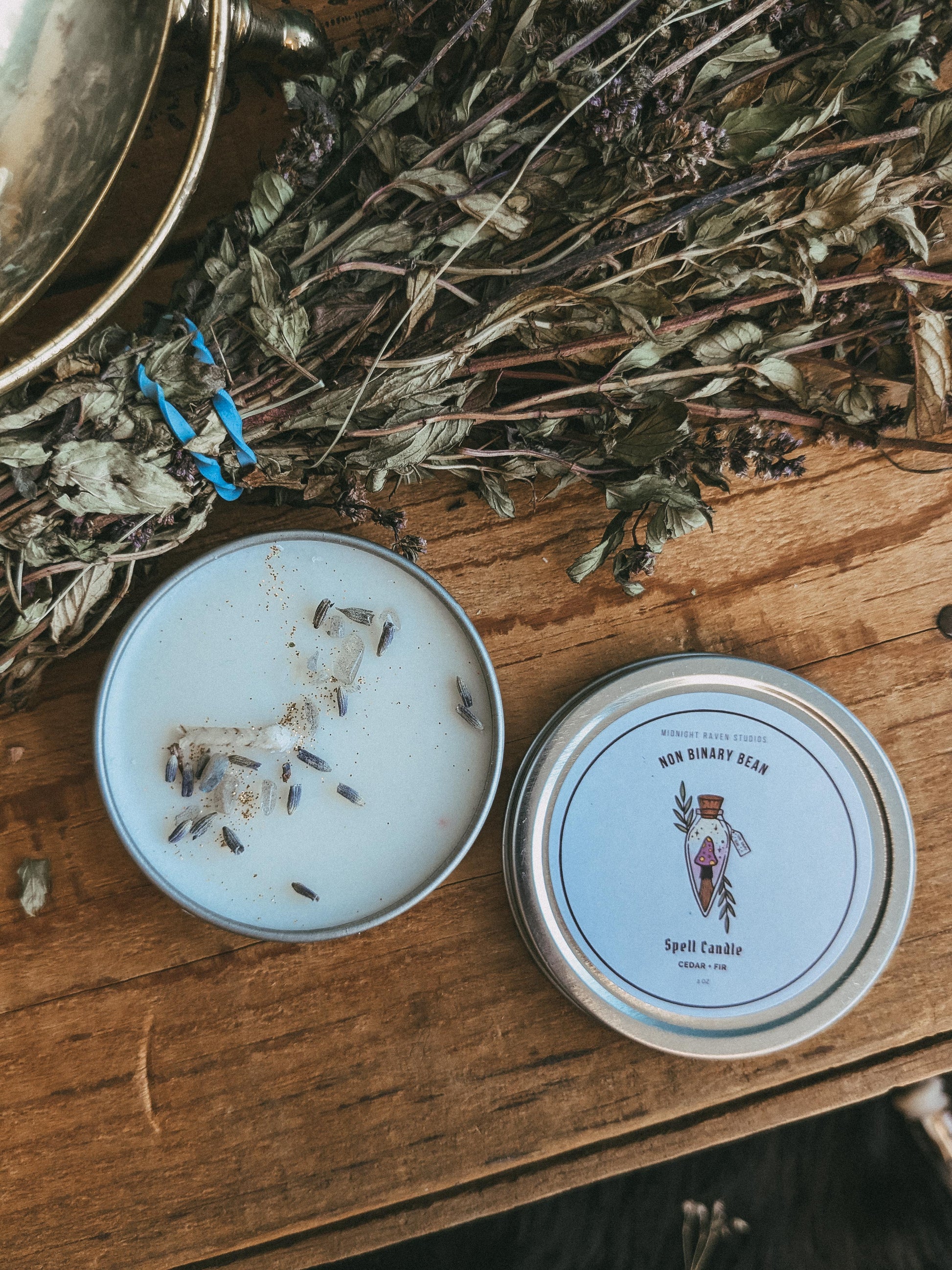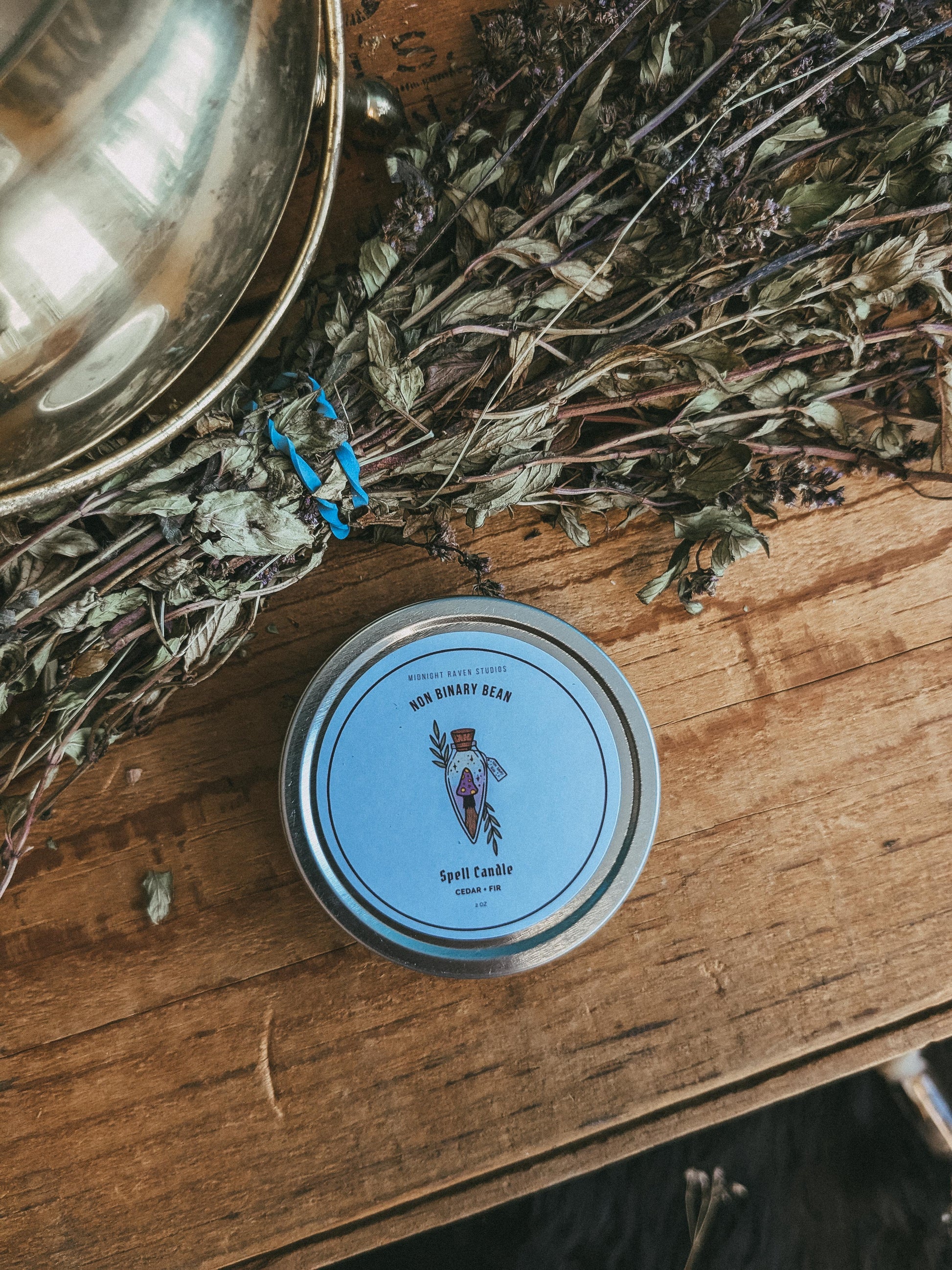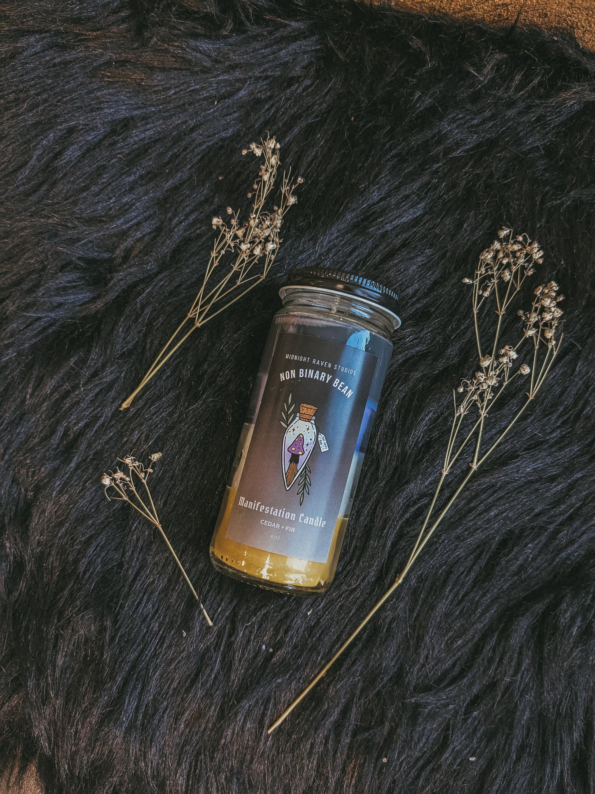 The Non-Binary Pride Candle is hand-poured in bold yellow, white, purple, and black stripes to reflect the non-binary pride flag, honoring fluidity, expansiveness, and identities that defy the binary. Scented with fir and cedar, this candle brings grounding, strength, and quiet power—like walking through a forest where every step affirms who you are.